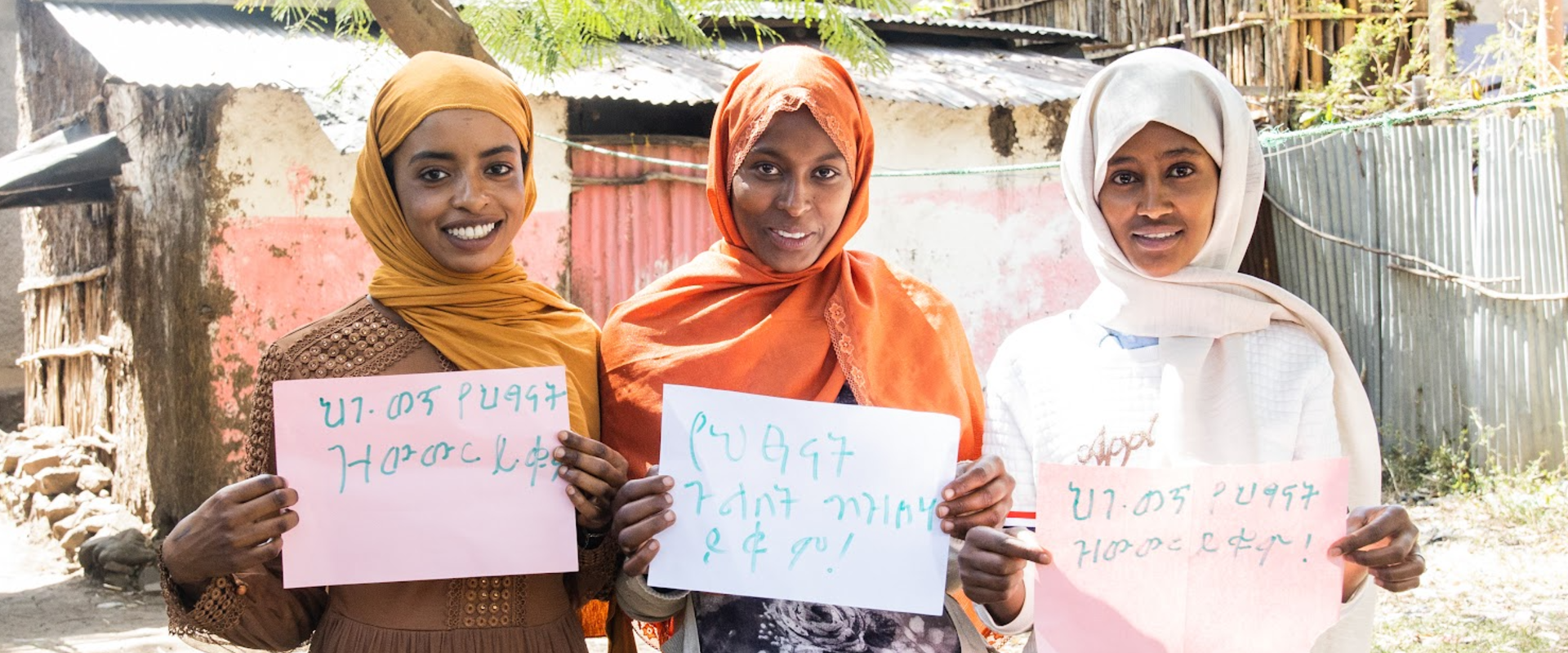 Youth activists Radwa, 18, Samira, 19, and Hayat, 18, hold up signs that read "Stop child trafficking!" "End child marriage!" and "End child labor!" in their native language, Amharic.